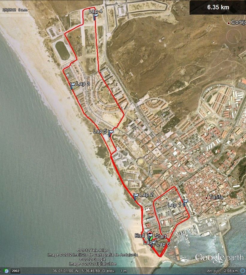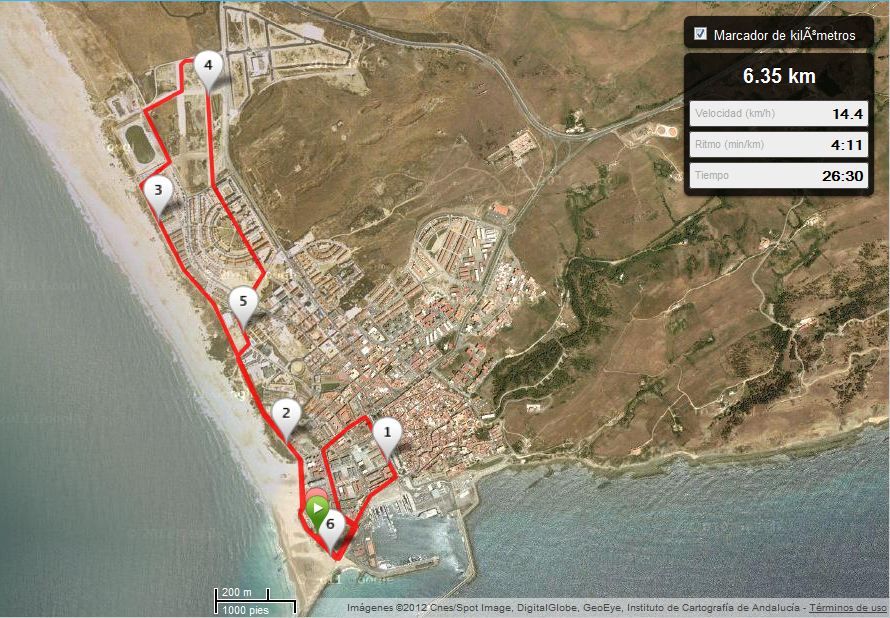 Recorrido de la carrera de Tarifa. Son 6 kms y 400 metros de recorrido urbano con una cuesta en el primer km y una subida suave en el cuarto kilómetro. Mucho llaneo y Paseo Marítimo. La Salida y la Meta están en el Polideportivo que está detrás del Cuartel de la Guardia Civil, al lado del Castillo de Santa Catalina y de la Playa Chica.